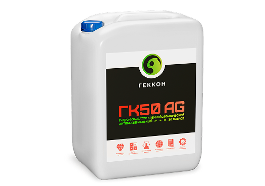 Геккон ГК50 Ag - представляет собой 50% дисперсию полиметилгидридсилоксана с применением функциональных добавок, содержащих, в качестве антисептика широкого спектра действия, нано частицы серебра. Применяется в качестве гидрофобизатора для поверхностной и объемной обработки пористых минеральных поверхностей, а также производства анти-адгезионных смазок.